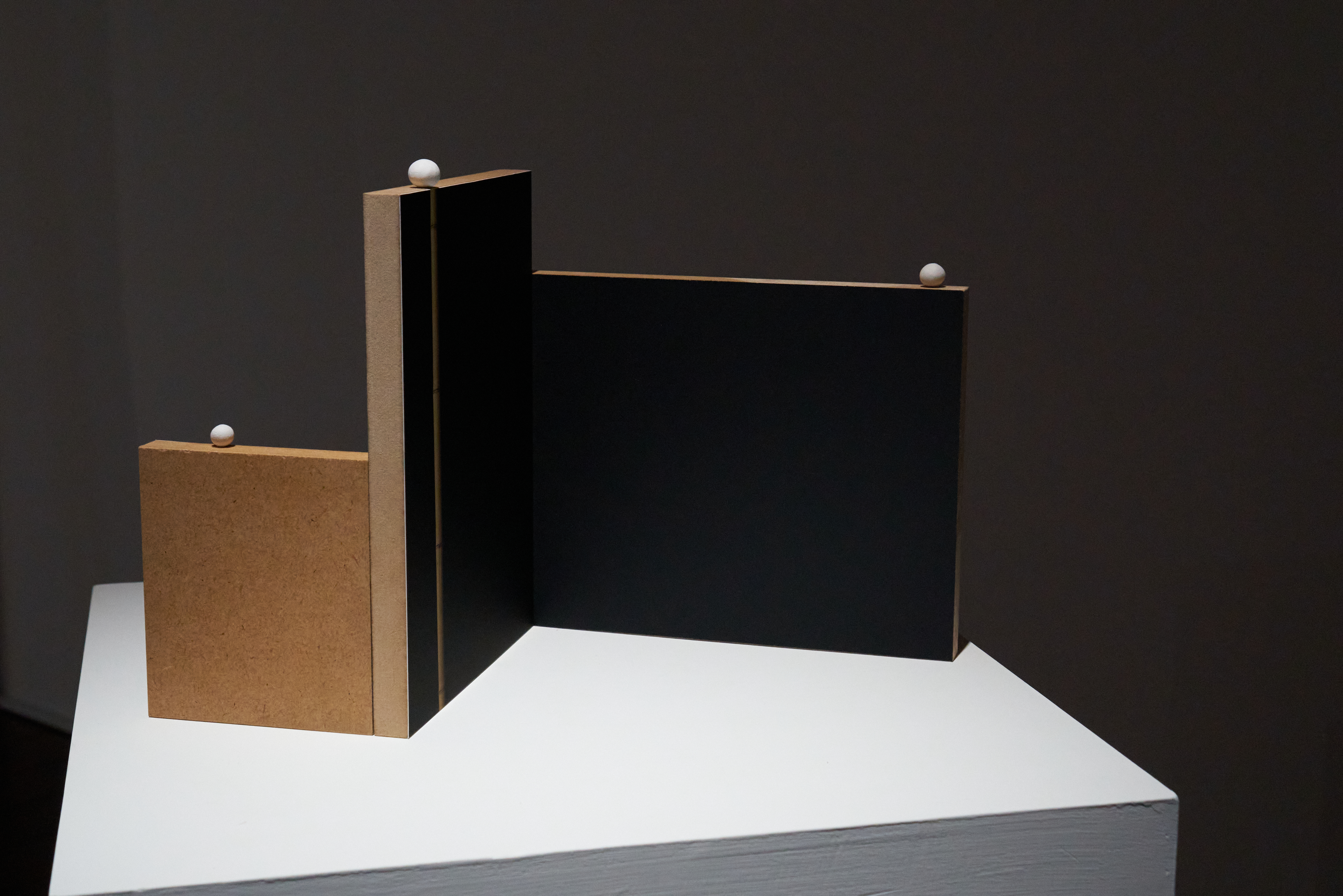 However, finding the way to combine these elements is not easy, much like identifying a new star in the pitch-black night sky, as our understanding of the world is so filled with biases. Yet, this is also a space filled with possibilities. I placed bamboo in front of a black curtain and photographed it, printing it on paper that doesn't reflect light at all. The black background is uniform like a block of color, but due to the presence of bamboo, the black squares imply a space with depth in all directions. I treat such spacetime as an object and combine it through repetition and stacking. The wooden board's hard surface and the white squares on the screen represent another dimension in contrast to the black space. What interests me is that our perception of objects is a continuous process of confirmation within these very subtle characteristics.